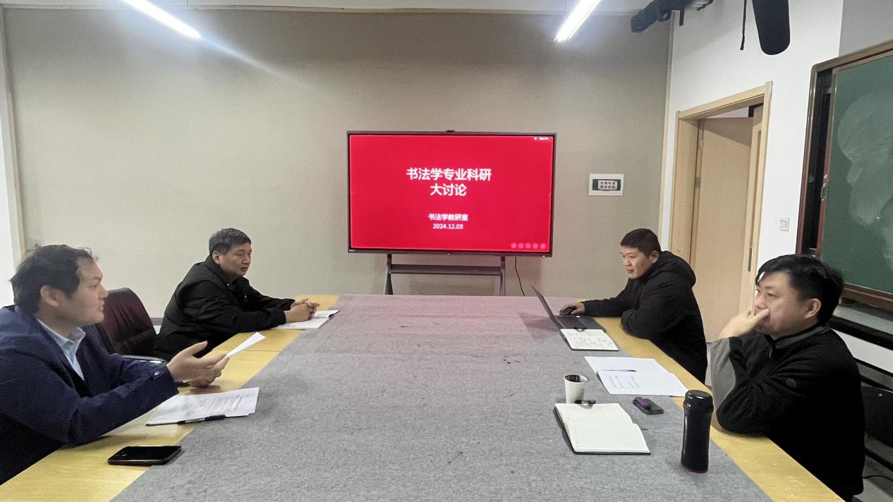 123日下午,在美术楼411书法学教研室,展开了书法学科的科研大讨论活动。书法研究所所长、书法学教研室主任张典友,书法学专业教师郭纲举、刘永亮、汤传盛,参与了讨论。